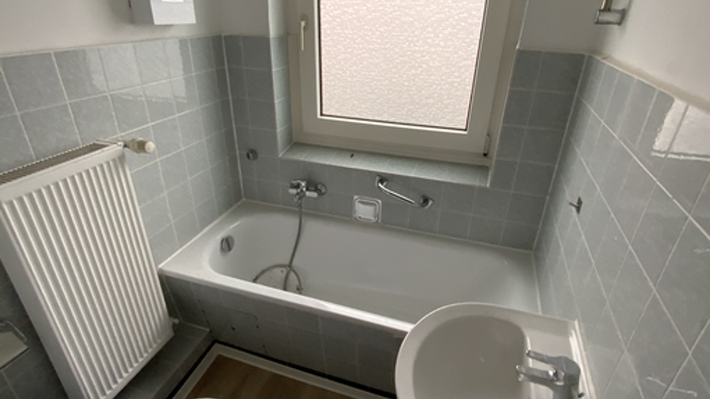Die Wohnung wird zurzeit renoviert und erhält einen neuen Laminatboden. Das Badezimmer erhält einen Vinylboden und wird ungefähr so aussehen wie auf dem Musterfoto.