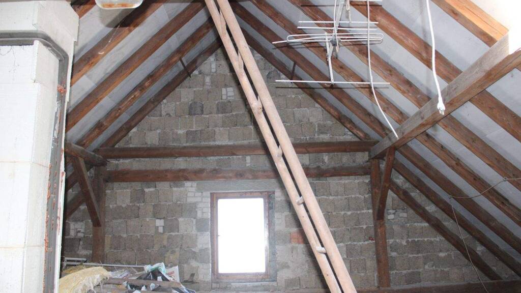 Weitere Holztreppe, die zum Ausbau vorbereiteten Dachgeschoss führt (Flur und Bad im Kellerbereich mit Fußbodenheizung)