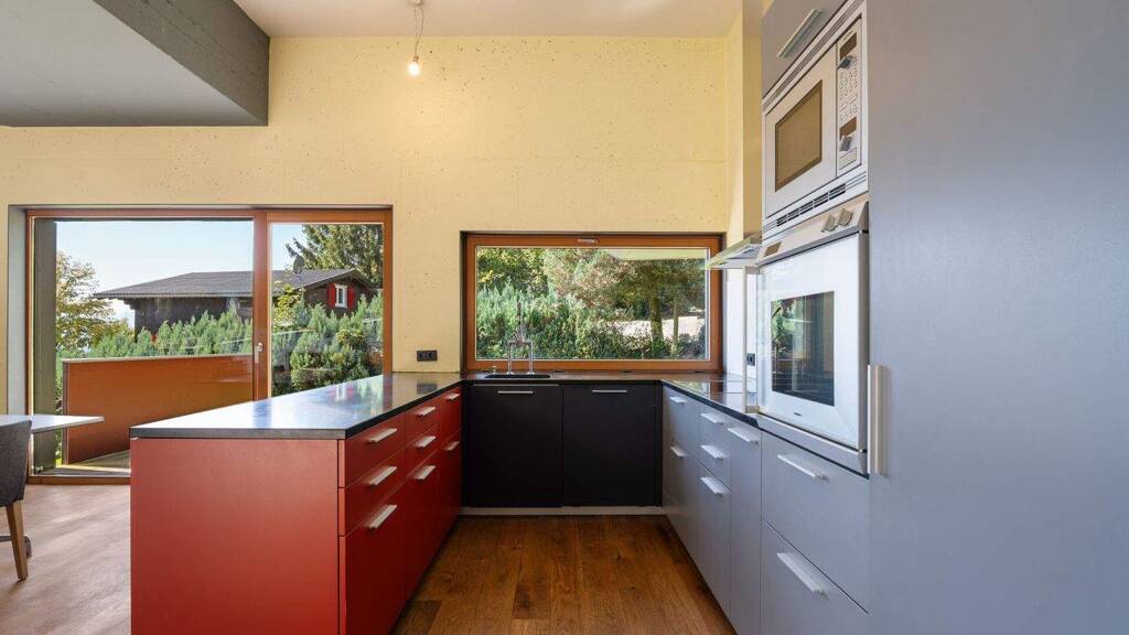 Im Dachgeschoss erwartet Sie ein verglastes Studio mit Panoramablick über das Rheintal bis zu den Schweizer Alpen - ein exklusiver Rückzugsort zum Arbeiten, Lesen oder Entspannen. Das Untergeschoss bietet mit einem großzügigen Hobbyraum, einem Waschraum und einem stilvollen Weinkeller zusätzlichen Raum für individuelle Bedürfnisse.