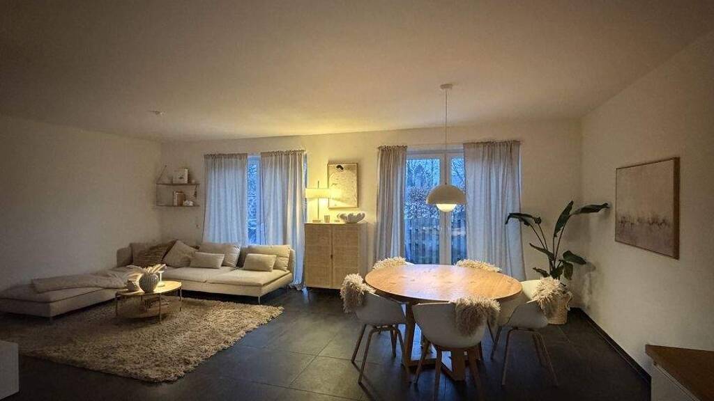 Im Erdgeschoss erwartet Sie ein offenes Wohnkonzept mit einer eleganten Küche, die zum gemeinsamen Kochen und Genießen einlädt. Das helle Wohnzimmer öffnet sich zur Sonnenterrasse, auf der Sie entspannte Nachmittage mit Blick in den liebevoll angelegten Garten verbringen können. Hier können Sie die ruhige Atmosphäre des ca. 493 m² großen Grundstücks voll auskosten.