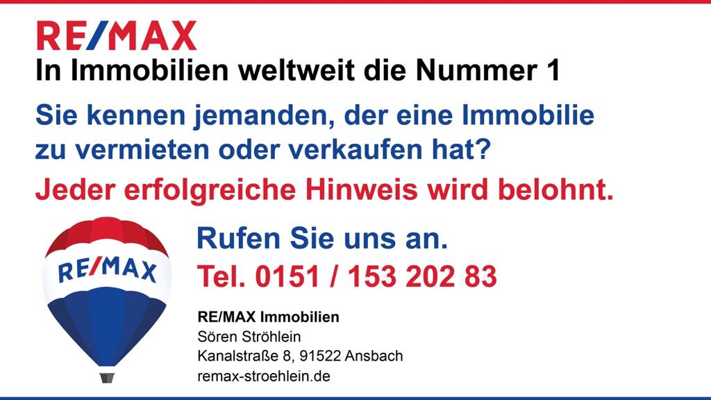 Unser Angebot erfolgt gemäß der uns vom Eigentümer erteilten Informationen, jedoch ohne Gewähr für die Richtigkeit und Vollständigkeit. Schadensersatzansprüche sind uns gegenüber, auch bei eigenen Fehlern, mit Ausnahme von grob fahrlässigem oder vorsätzlichem Verhalten, ausgeschlossen. Eine Weitergabe an Dritte ist nicht gestattet. Jeder RE/MAX- Franchise- und Lizenznehmer ist ein rechtlich eigenständiges Unternehmen.