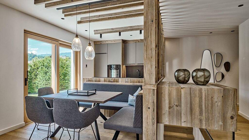 Der offene Wohn- und Essbereich mit bodentiefen Fenstern und raumhohen Glasfronten ist lichtdurchflutet und ein echtes Highlight. Altholzelemente, stilvolle Materialien und hochwertige Möblierung schaffen ein elegantes, gemütliches Ambiente.