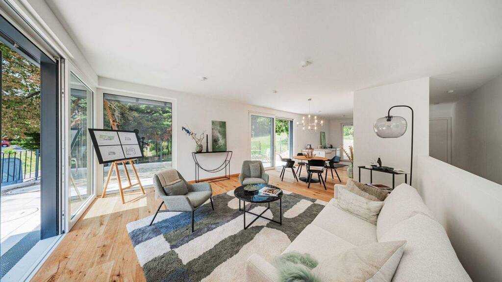 Im Vordergrund steht eine nachhaltige Bauweise mit moderner Architektur in Einklang zu bringen. Große Fensterelemente und Freiflächen beziehen dabei die Natur in den Wohnraum mit ein, und schaffen damit aus jedem Fenster entspannende Ausblicke ins Grüne.