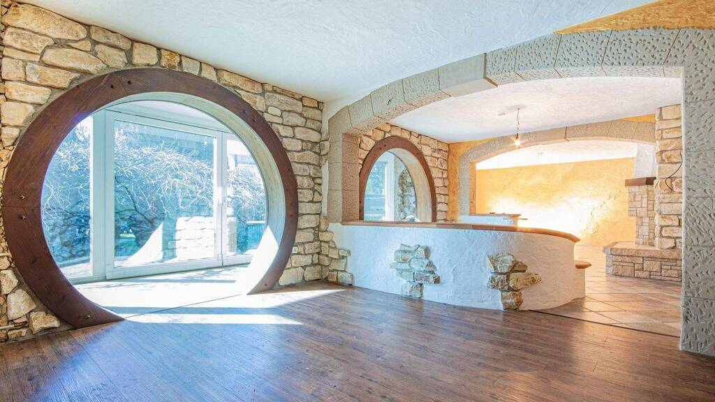Bereits im Erdgeschoss beeindruckt das Haus mit einem ganz besonderen Wohnambiente. Das großzügige Wohnzimmer mit seinen charakteristischen Rundbögen, Natursteinelementen und dem gemütlichen Schwedenofen verleiht dem Raum eine außergewöhnliche Atmosphäre. Der angrenzende Wintergarten sorgt für viel Licht und verbindet das Wohnen harmonisch mit dem Gartenbereich.