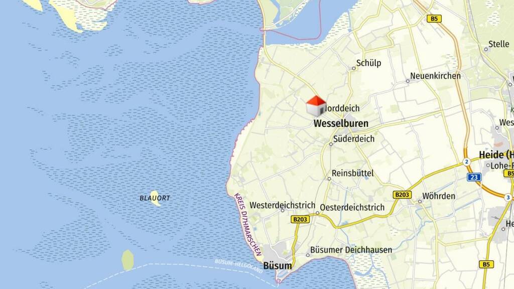 Norddeich ist eine kleine Gemeinde im Kreis Dithmarschen in Schleswig-Holstein und liegt unweit der Nordseeküste inmitten der typischen Marschlandschaft. Der Ort befindet sich nordwestlich im Kreisgebiet, in direkter Nachbarschaft zur Stadt Wesselburen sowie zu den Gemeinden Wesselburerkoog, Süderdeich, Schülp und Hellschen-Heringsand-Unterschaar. Die Lage ist geprägt von weiten Feldern, landwirtschaftlich genutzten Flächen und der Nähe zum Wattenmeer, was dem Ort einen ruhigen, ländlichen und zugleich maritim geprägten Charakter verleiht. Norddeich ist verkehrlich gut angebunden, da Wesselburen mit Einkaufsmöglichkeiten, Bahnanschluss und Infrastruktur nur wenige Minuten entfernt liegt. Die Nähe zur Nordsee bietet zudem vielfältige Freizeit- und Erholungsmöglichkeiten, sodass die Gemeinde sowohl für Anwohner als auch für Urlauber eine attraktive, naturnahe Lage bietet.