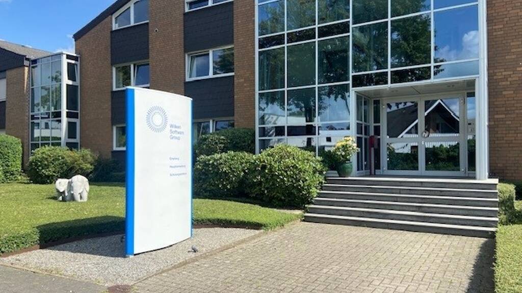 Die Büroimmobilie liegt an einer ruhigen Seitenstraße in Greven. Der verglaste Haupteingangsbereich ist einer von zwei zur Straße gelegenen Eingangsbereiche, mit jeweils einem Treppenhaus. Ein Personenaufzug befördert Sie von hier aus in die oberen Geschosse bis zu den Konferenzräumen im obersten Teilgeschoss.