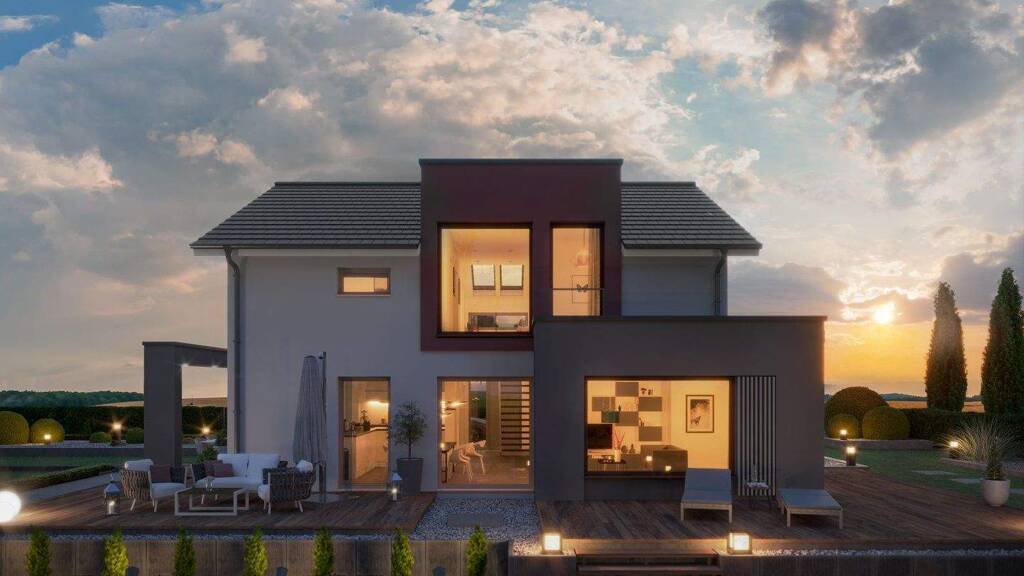 Dieses Musterhaus besticht durch eine markante Architektur mit Übereck-Erkern, farbigen Akzenten und einem spannenden Zusammenspiel aus klassischem Satteldach und modernem Zwerchgiebel. Im Inneren prägt ein offenes, lichtdurchflutetes Raumkonzept das Erdgeschoss, mit fließendem Übergang von Diele zu Wohn-, Ess- und Kochbereich sowie einem separat gelegenen Homeoffice. Die Küche fungiert als zentraler Treffpunkt für die Familie, während breite Fensterfronten für ein großzügiges Wohngefühl sorgen. Im Dachgeschoss bieten zwei Kinderzimmer mit eigenem Bad sowie ein Elternbereich mit Ankleide und Familienbad komfortable Rückzugsorte.