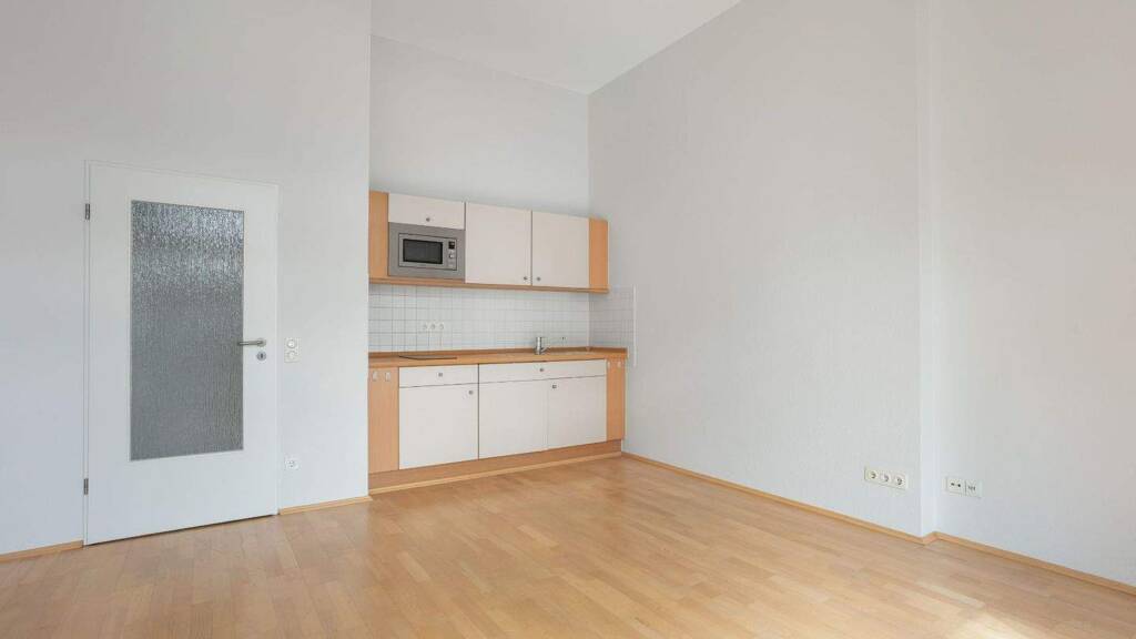 Über die Diele gelangen Sie nicht nur in das gepflegte Duschbadezimmer sondern auch in den großzügigen Wohnbereich der Einzimmerwohnung. Durch die gute Grundrissgestaltung können Sie sich hier frei entfalten und neben einem Schlafbereich auch eine Wohnecke in die Räumlichkeit integrieren. Das Apartment ist zudem mit einer Einbauküche mit Elektrogeräten ausgestattet. Die großen doppeltverglasten Fenster verleihen der Wohnung ein offenes und lichtdurchflutetes Raumgefühl und sorgen zu jeder Jahreszeit für viel Tageslicht und ein freundliches Ambiente. Neben den hohen Decken rundet der Parkettfußboden den Charme des Apartments ab.