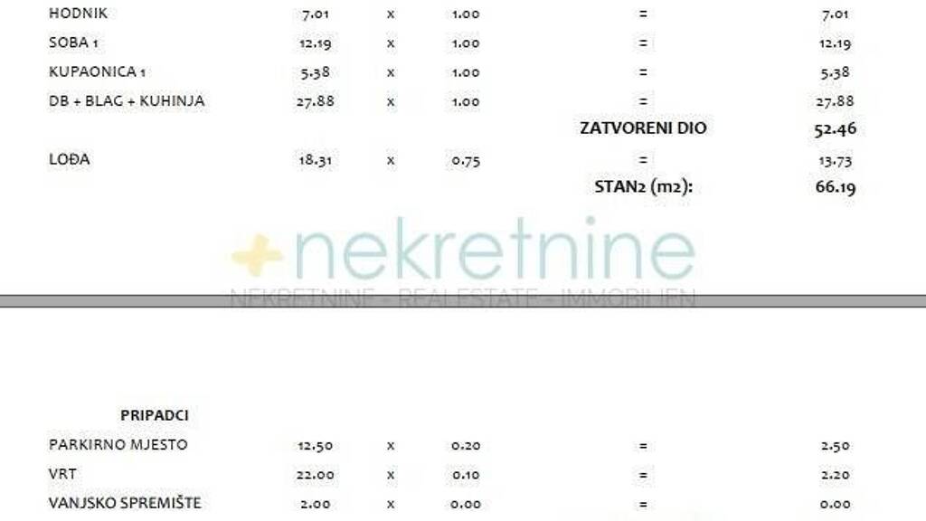 SV. FILIP I JAKOV LUKSUZAN STAN S2 U PRIZEMLJU ZGRADE Na mirnoj lokaciji u Sv. Filipu i Jakovu gradi se moderna zgrada s ukupno 12 stambenih jedinica, pruzajuci savrsen spoj mira, udobnosti i suvremenog dizajna. DETALJI STANA S2 Lokacija: Prizemlje Povrsine i raspored: Unutarnja stambena povrsina: 52,46 m Velika natkrivena terasa: 15,96 m Manja natkrivena terasa (izlaz iz spavace sobe): 2,35 m Privatni vrt: 22 m Ukupna prodajna netto povrsina: 70,80 m Parkirno mjesto: Jedno mjesto osigurano uz zgradu Dodatno: Mogucnost kupnje spremista iza zgrade OPREMA I KARAKTERISTIKE ZGRADE Stan i zgrada opremljeni su prema najnovijim gradevinskim standardima: Lift za udobnost i pristupacnost PVC stolarija: Troslojna stakla, elektricne aluminijske rolete, komarnici Zgrada spojena na gradski vodovod i kanalizaciju Zidovi: Gradeni ciglenim blokom s 10 cm stiropor izolacijom Elektricno podno grijanje u kupaonici Grijanje i hladenje putem klima uredaja Portafon za sigurnost Podne obloge: Kvalitetne keramicke plocice u dnevnom boravku, kuhinji, kupaonici, WC-u i hodniku; mogucnost izbora podnih obloga u ranoj fazi gradnje Krovna terasa: Prikljucci za struju i vodu Energetski razred: A ZAVRSETAK RADOVA: Lipanj 2025. Ovaj luksuzni stan pruza savrsen spoj doma i investicije. Bilo da trazite obiteljski dom ili idealno mjesto za odmor, ovaj stan zadovoljava sve vase potrebe. LOKACIJA Sv. Filip i Jakov savrsena je destinacija za one koji traze miran zivot blizu svih sadrzaja: Udaljenost od mora: 800 m Zadar: 30 minuta voznje Zracna luka Zadar: 25 minuta voznje U neposrednoj blizini trgovina, kafica, restorana i drugih sadrzaja. KONTAKT Ne propustite priliku za kupnju ovog luksuznog stana na izvanrednoj lokaciji! +385 95 893 8595 info@plusnekretnine.hr Vas novi dom ceka vas u srcu Dalmacije!
