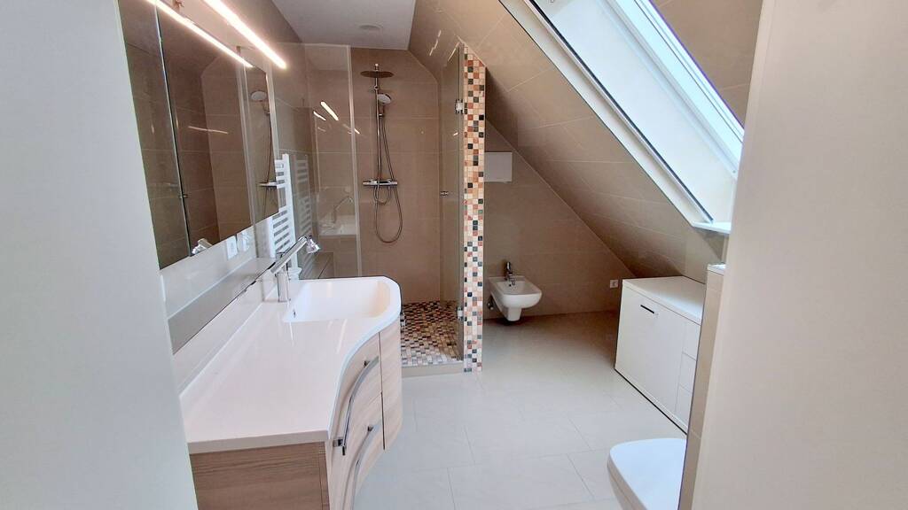 Der großzügige Hauptwohnbereich in der unteren Ebene überzeugt mit edlen Natursteinfliesen in Parkettoptik und einer modernen Fußbodenheizung, die in jedem Raum individuell regulierbar ist. In der oberen Ebene sorgt ein weiteres Zimmer mit separatem Bad und klassischen Heizkörpern für zusätzlichen Komfort – ideal als Gästebereich oder Homeoffice.