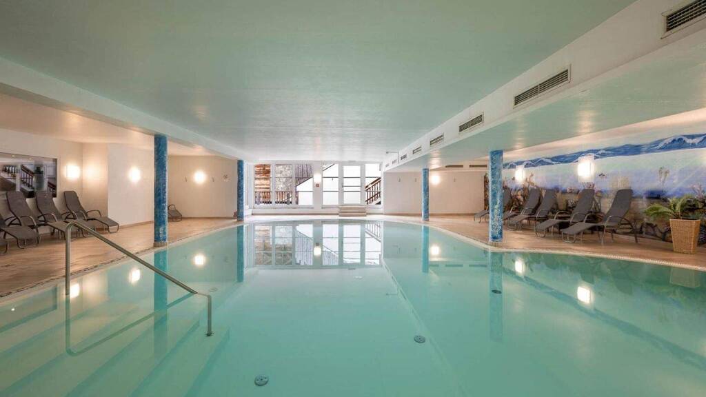 The apartment also includes a private basement storage unit and a garage parking space within the building. Another highlight is the in-house wellness area featuring an indoor pool and sauna, available to residents and offering soothing relaxation after an active day of skiing or hiking.