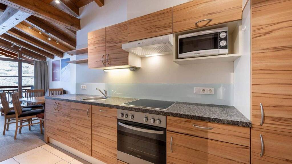 Die Wohnung überzeugt mit einer klar strukturierten und funktionalen Aufteilung: Vom Eingangsbereich mit Garderobe gelangen Sie in den offenen Wohn- und Essbereich, der gemeinsam mit der integrierten Küche das Herzstück der Einheit bildet. Von hier aus besteht Zugang zum Balkon, der zusätzlichen Freiraum bietet. Zwei getrennte Schlafzimmer ermöglichen eine komfortable Nutzung für Familie und Gäste. Besonders praktisch sind die zwei Badezimmer, jeweils mit Dusche und WC ausgestattet - ein echter Mehrwert bei Ferienimmobilien dieser Größe. Warme Holzelemente und die sichtbare Dachkonstruktion verleihen den Räumen eine gemütliche, alpine Atmosphäre.