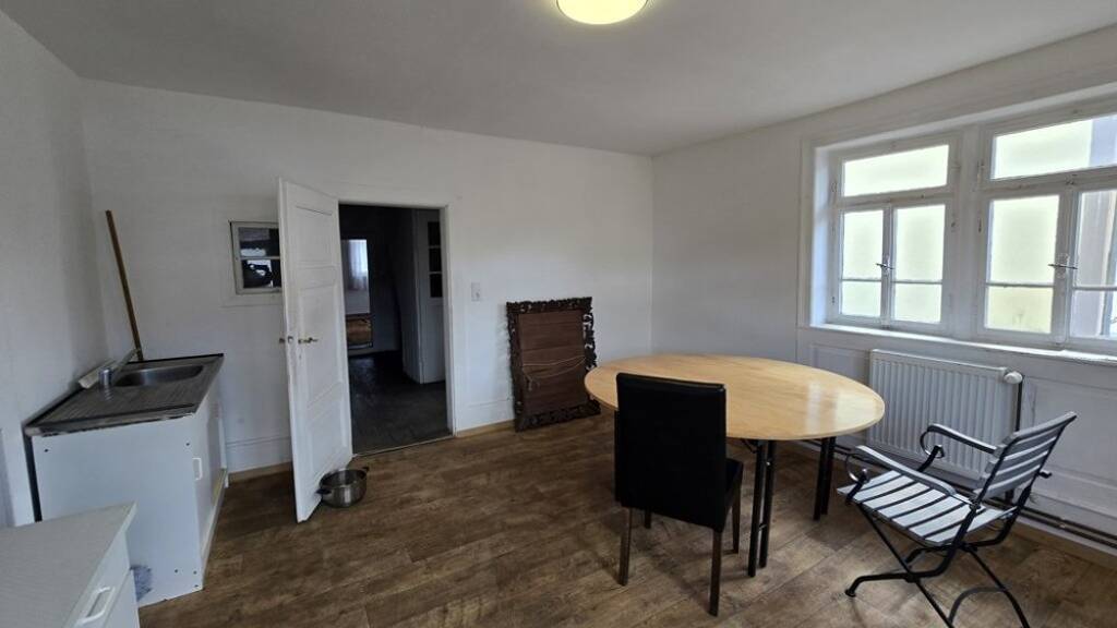 großer Wohnraum mit Fachwerk-Balken als Raumtrenner, zwei weitere Zimmer, Küche mit Platz für Essbereich, Duschbad