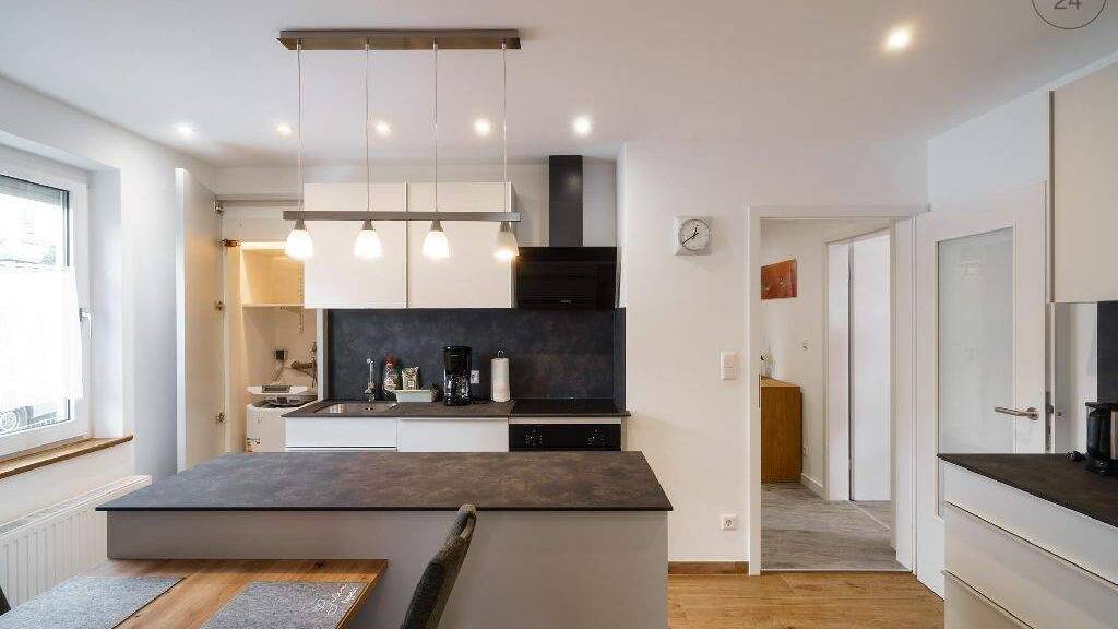 Die hochwertige Einbauküche ist vollständig ausgestattet und bietet eine Spülmaschine, ein Cerankochfeld mit Dunstabzugshaube, einen Backofen sowie einen Einbaukühlschrank mit separatem Gefrierfach (3 Fächer). Ein zusätzlicher Essplatz für zwei Personen wurde ebenfalls integriert. Geschirr und Kochgeschirr sind vorhanden.