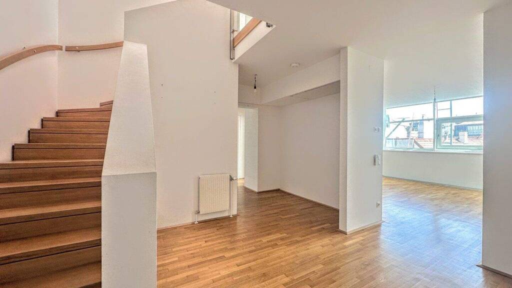 The apartment spans the 6th and 7th floors and impresses with a striking glass façade, whose curved lines give the apartment a distinctive architectural character. This façade not only provides a generous sense of space and abundant natural light but also offers a view of St. Stephen's Cathedral.