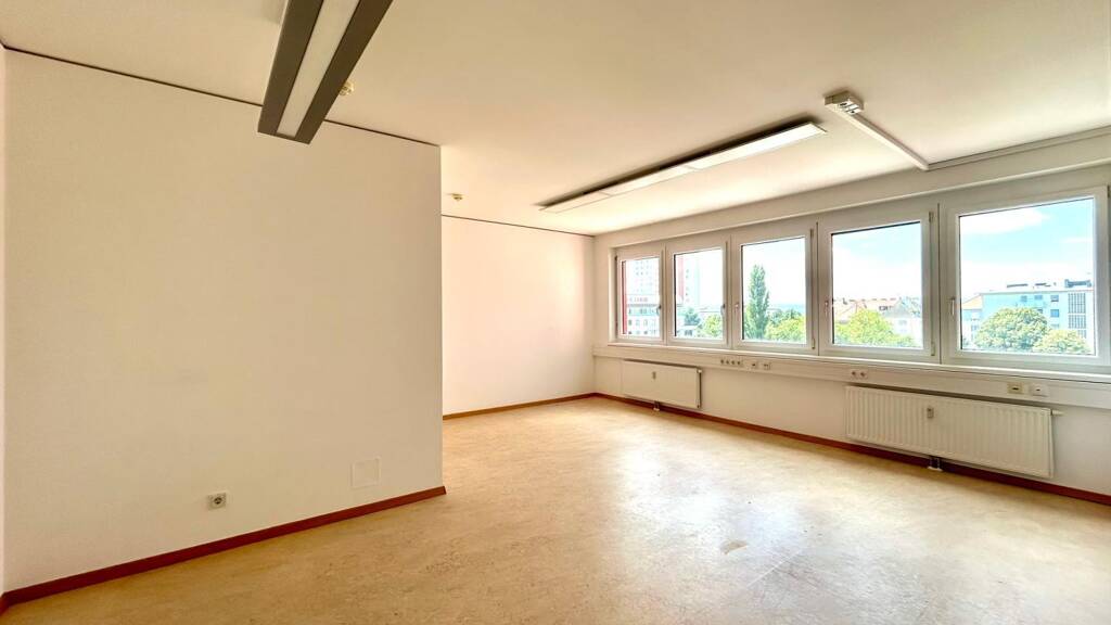 Diese helle Bürofläche gliedert sich in zwei ähnlich große Räume, die durch eine Glaswand getrennt sind. In einer Nische ist Platz für eine kleine Teeküche - Anschlüsse sind vorhanden.