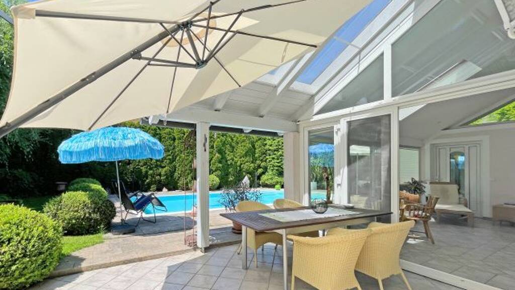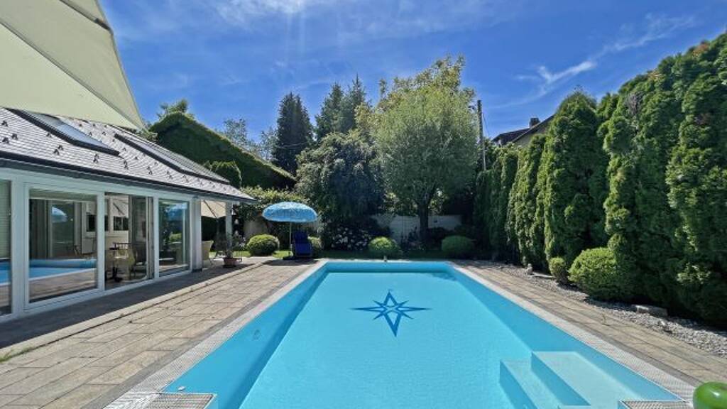 Der großzügige, liebevoll angelegte Garten mit gepflegten Rasenflächen und der sonnigen Terrasse lädt zum Entspannen und Verweilen ein. Herzstück ist der beheizbare Pool (ca. 40 m²), der für entspannte Sommertage und höchste Lebensqualität sorgt.
