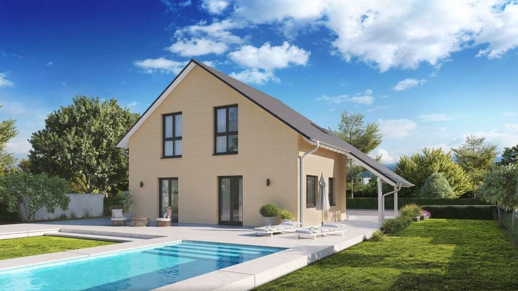 Intelligente Lösungen sind besonders gefragt, wenn es um kleine Grundstücke oder begrenzten Raumbedarf geht, und eine durchdachte Aufteilung ist hierbei entscheidend. Das Designhaus 18.3 bietet eine Gesamtwohnfläche von etwa 137 m² auf zwei Etagen, die bis ins kleinste Detail durchdacht sind. Dieses elegante Einfamilienhaus verfügt über ein Satteldach mit Schleppdach, das sich perfekt als Carport oder Stellplatz für ein Fahrzeug eignet. Der offen gestaltete Wohn-Ess-Bereich verspricht hohen Wohnkomfort und wirkt durch die bodentiefen Fenster noch großzügiger, während er einen Blick ins Grüne ermöglicht. Im Erdgeschoss finden sich außerdem die geschlossene Küche, ein Hauswirtschaftsraum und ein kleines Bad. Im Dachgeschoss sind das Schlafzimmer, das Kinderzimmer sowie ein Badezimmer mit Badewanne, Dusche und WC direkt erreichbar, was eine flexible Raumaufteilung ermöglicht.