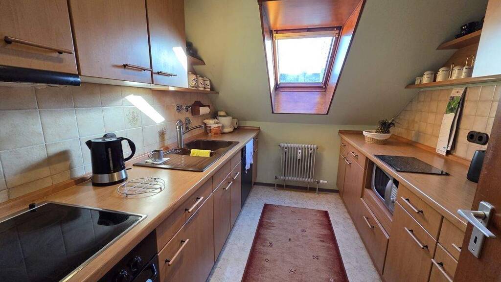 Das Schlafzimmer mit ca. 13,68 m² ist gut geschnitten und bietet ausreichend Platz für ein Doppelbett sowie große Schränke. Die separate Küche ist funktional gestaltet, länglich geschnitten und verfügt über ein Dachflächenfenster. Das Badezimmer ist ebenfalls länglich ausgeführt, mit Dachfenstern ausgestattet und bietet sowohl eine Badewanne, als auch eine Dusche.