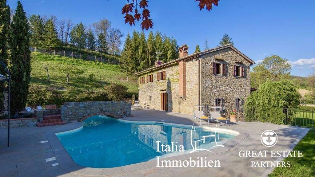 Zum Verkauf steht ein herrliches Landgut, aufgeteilt in zwei Bauernhäuser, nur wenige Minuten von den Casentino-Wäldern entfernt, mit einem fantastischen Pool in Form eines Schmetterlings und insgesamt 6 Schlafzimmern und 7 Badezimmern.
