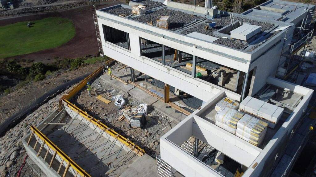 4J • 354 m² Wohnfläche auf einem Grundstück von 738 m² • 3 Etagen (2 oberirdische Ebenen + großes Untergeschoss mit Tageslicht) • 3 Schlafzimmer im Obergeschoss + multifunktionaler Raum im Untergeschoss • 4 Badezimmer + 2 Gäste-WCs • Südorientierung – spektakuläre 360-Grad-Aussicht auf den Golfplatz, das Meer und die Dünen von Maspalomas