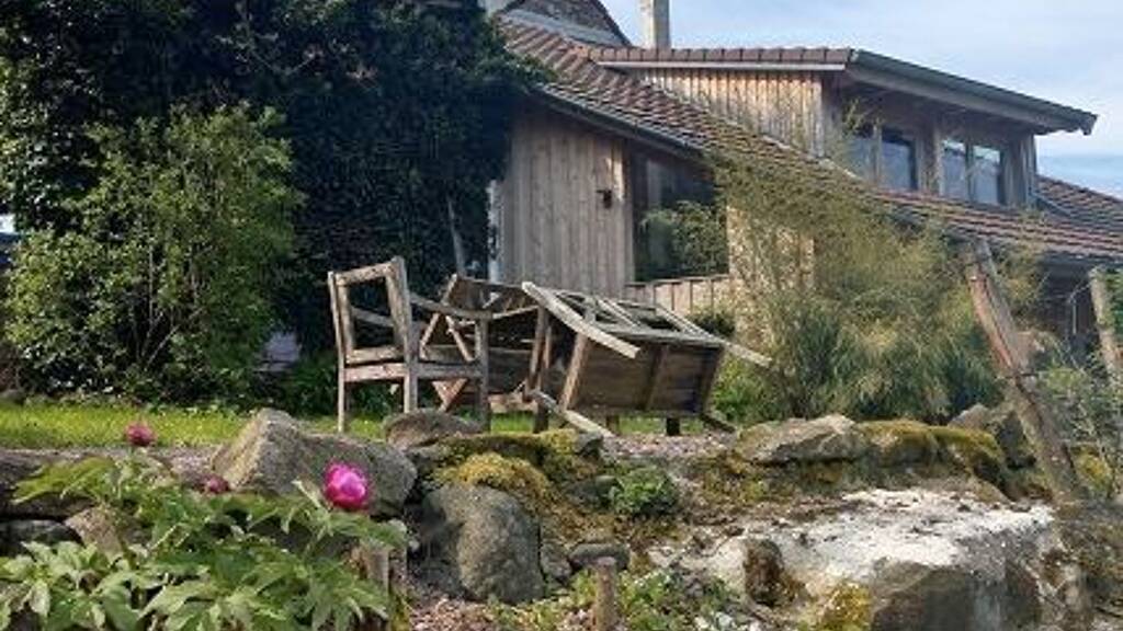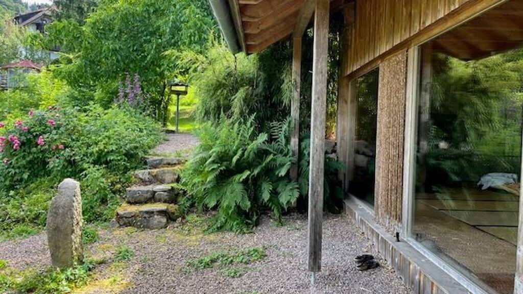 Das Grundstück ist teilweise terrassiert und kann somit gut genutzt werden; direkt am Haus sind ein schattiger Sitzplatz unter einem Nussbaum, ein kleiner Zen-Garten und eine Grillstelle.