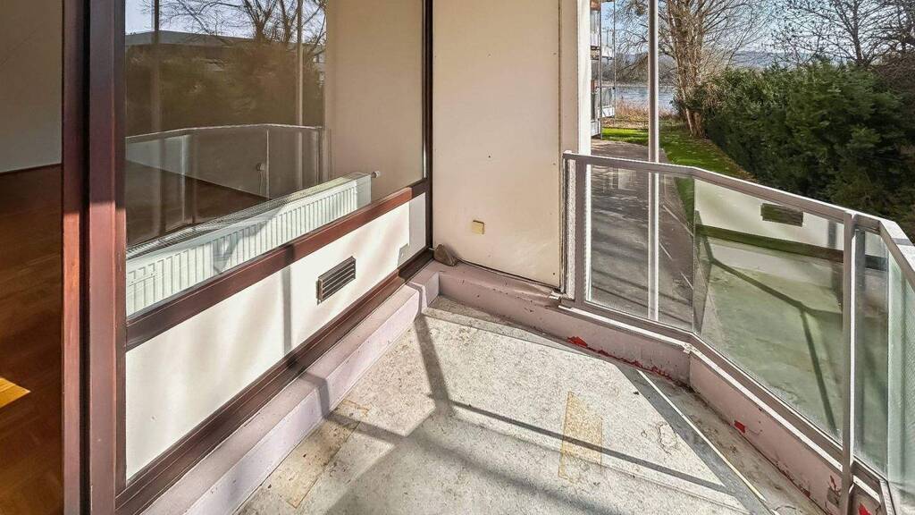 Ein besonderes Highlight der Wohnung ist die großzügige Loggia, die direkt vom Wohnbereich aus zugänglich ist. Sie erweitert den Wohnraum nach außen und bietet einen wunderbaren Ort zum Entspannen. Von hier aus genießen Sie einen attraktiven Blick auf den Rhein. Eine seltene Qualität, die der Wohnung eine besondere Atmosphäre und hohen Wohnwert verleiht.