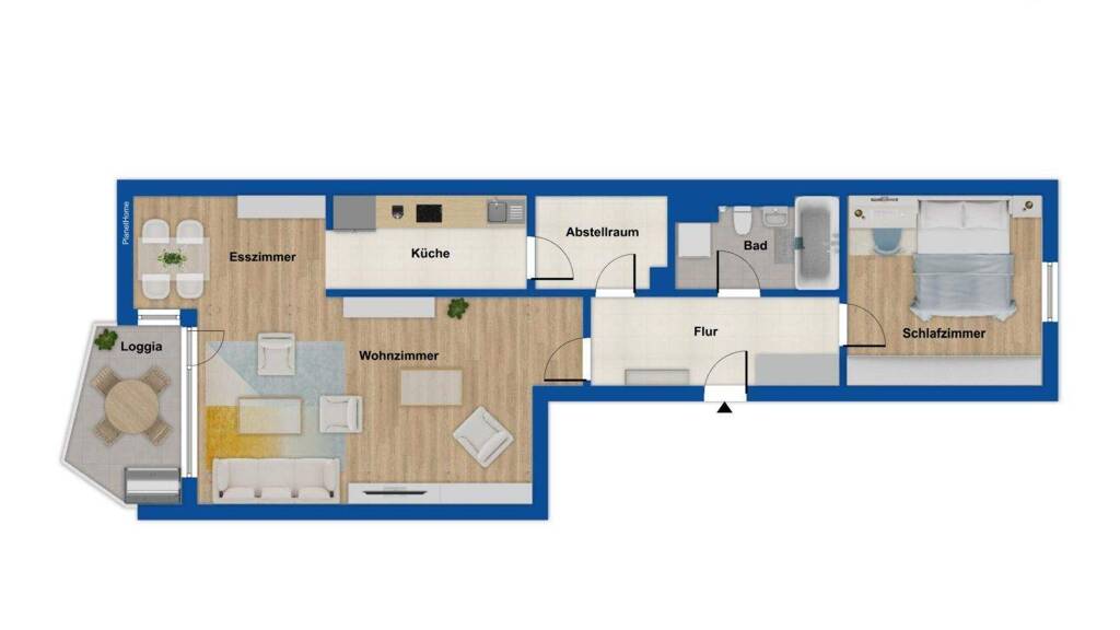 Das Schlafzimmer präsentiert sich ruhig gelegen und bietet ausreichend Platz für ein großes Bett sowie einen geräumigen Kleiderschrank. Es schafft eine angenehme Rückzugsmöglichkeit und unterstreicht den komfortablen Charakter der Wohnung. Das Badezimmer ist funktional gestaltet und harmonisch in den Grundriss integriert. Ergänzt wird das Raumangebot durch einen praktischen Abstellraum innerhalb der Wohnung, der zusätzlichen Stauraum für Haushaltsgegenstände bietet.