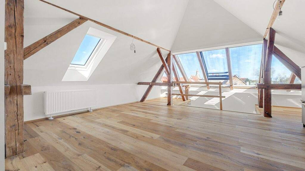 Treten Sie ein und entdecken Sie diese exquisite Maisonette - Dachgeschosswohnung, diese sich auf 85,57m² erstreckt. Vom Eingangsbereich gelangen Sie in das großzügige Wohn- Essbereich. Vom Essbereich aus, kommen Sie in die jeweiligen zwei Zimmer, diese Sie zum einen als Schlafzimmer und zum anderen als Kinder- oder Ankleidezimmer, sowie Büro nutzen können. Vom Gang gelangen Sie ebenso zum Badezimmer, samt WC, Waschbecken und einer Badewanne, die zum Verweilen einlädt.