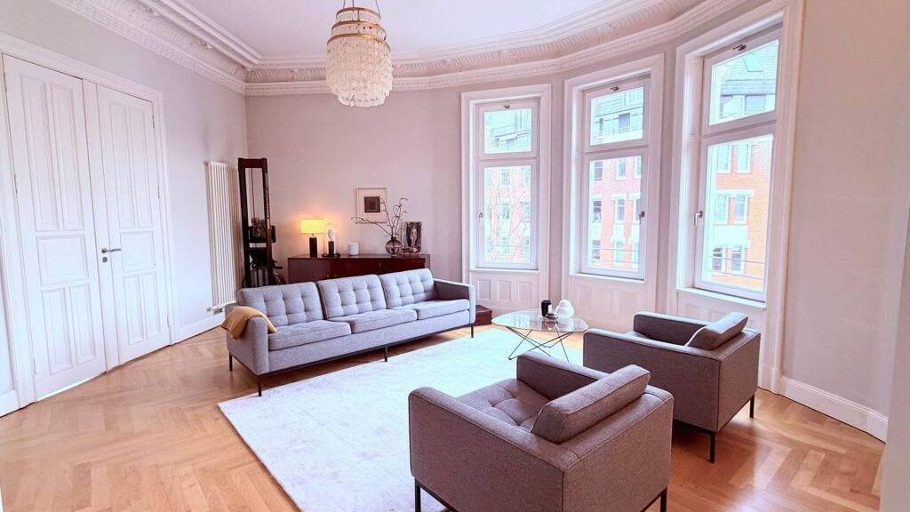 Willkommen in einer Residenz, die höchsten Ansprüchen gerecht wird. Diese außergewöhnliche, hochherrschaftliche Wohnung befindet sich in einem denkmalgeschützten Altbau aus dem Jahr 1877, der 2012 mit größter Sorgfalt und Liebe zum Detail umfassend saniert wurde. Hier verbinden sich historische Pracht und moderne Annehmlichkeiten zu einem einzigartigen Wohngefühl im Herzen Hamburgs.