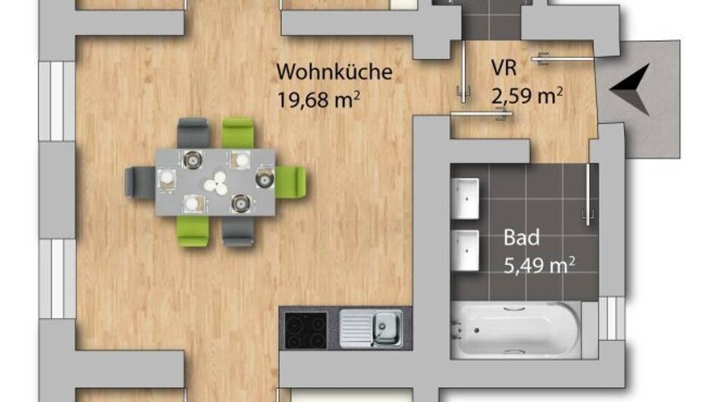 Top 5 befindet sich im Obergeschoß und ist südwestseitig ausgerichtet. Die Wohnfläche von ca. 81m² verteilt sich auf Vorraum, Bad, separates WC, Wohnküche, Wohnzimmer und Schlafzimmer.