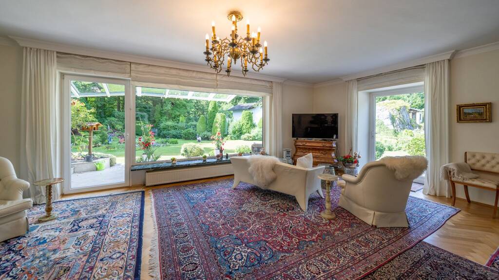 Im Erdgeschoss empfängt Sie ein offen gestaltetes Wohnzimmer mit wundervollem Blick in den weitläufigen Garten. Direkt angrenzend lädt ein gemütliches Esszimmer zu gemeinsamen Mahlzeiten und geselligen Abenden ein - der fließende Übergang zwischen den Räumen unterstreicht das luftige, lichtdurchflutete Wohngefühl. Über die angrenzende Terrasse betreten Sie ein weiteres Zimmer mit gemütlichem Kaminofen.