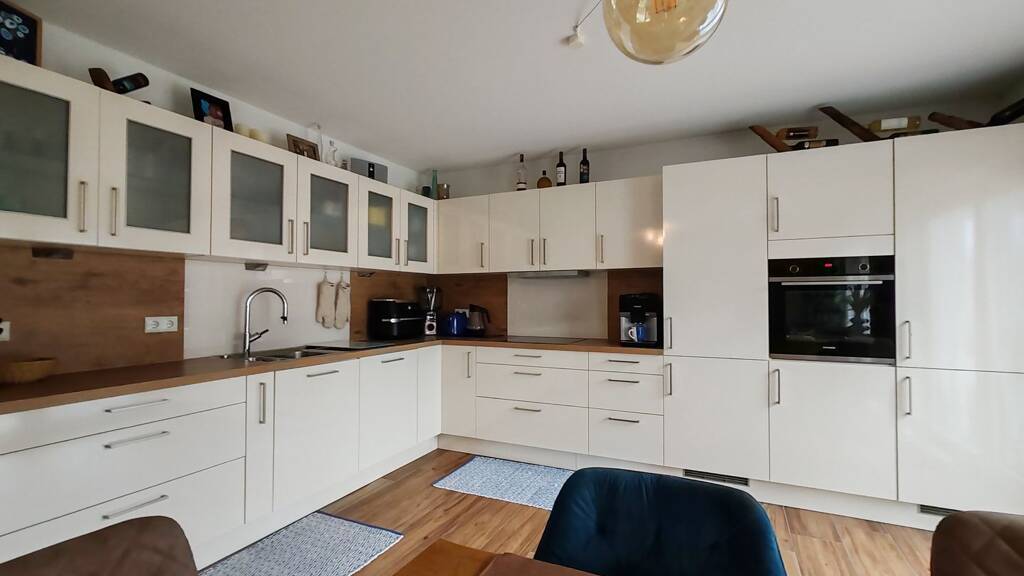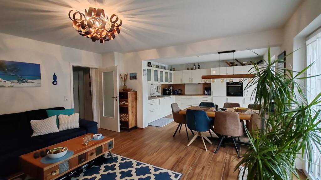 Der helle Wohn- und Essbereich mit offener Küche bildet das Herzstück der Wohnung und lädt zum Verweilen ein. Große Fensterflächen sorgen für eine freundliche, lichtdurchflutete Atmosphäre. Von hier aus gelangen Sie direkt in den weitläufigen Garten - perfekt für entspannte Stunden im Freien, Familienzeit oder gesellige Abende.