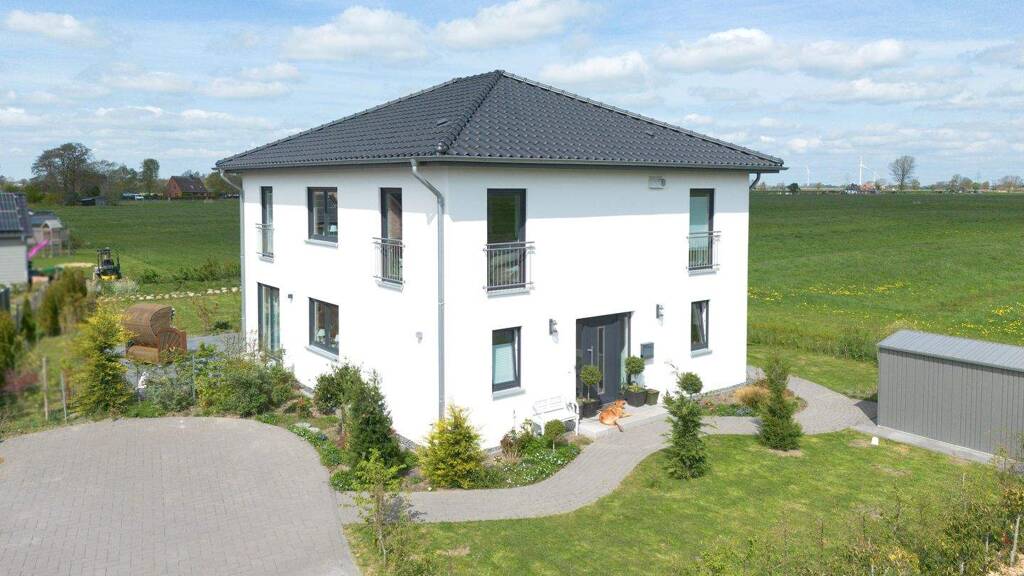 Team Massiv Haus zählt zu den Marktführern für die Planung und den Bau von exklusiven Wohnhäusern in Norddeutschland. Das Unternehmen verbindet individuelle, anspruchsvolle Architektur mit traditioneller, hochwertiger Massivbauweise in Kombination mit modernster Technik. Diese, im Jahr 2022, auf Pfahlgründung erstellte Stadtvilla präsentiert sich von der Auffahrt bis zum zweiten Vollgeschoss als ideal geplantes Haus für Menschen, die es gerne, hell, freundlich und etwas großzügiger mögen. Der Grundriss im Erdgeschoss ist offen gestaltet und von der Diele fällt der Blick in den ca. 42 m² großen Wohn- und Essbereich. Bodentiefe Fenster spenden hier reichlich Licht und bringen die Räumlichkeiten ausgesprochen gut zur Geltung. Die voll ausgestattete Küche mit angrenzender Speisekammer ist ebenfalls offengehalten, kann aber durch eine bereits verbaute Glasschiebetür separiert werden und schließt sich dem Essbereich an. Ein sehr schön ausgestattetes Gästeduschbad sowie ein großer Hauswirtschaftsraum der über eine Hausnebeneingangstür verfügt, komplettieren diese Ebene. Das zweite Vollgeschoss erreicht man über eine offen ausgeführte Eichenholztreppe mit weißen Wangen und mit Eichenhandlauf. Hier befinden sich vier Zimmer, eins davon mit Vollbad en suite, welches über ein sehr schönes Raumkonzept verfügt. Der über dieser Etage befindliche Bodenraum bietet zusätzlich reichlich Staufläche. Überzeugen Sie sich selbst von dieser schönen Immobilie und vereinbaren einen Besichtigungstermin und lassen sich begeistern. Wir freuen uns darauf, Ihnen diese Stadtvilla persönlich präsentieren zu dürfen.