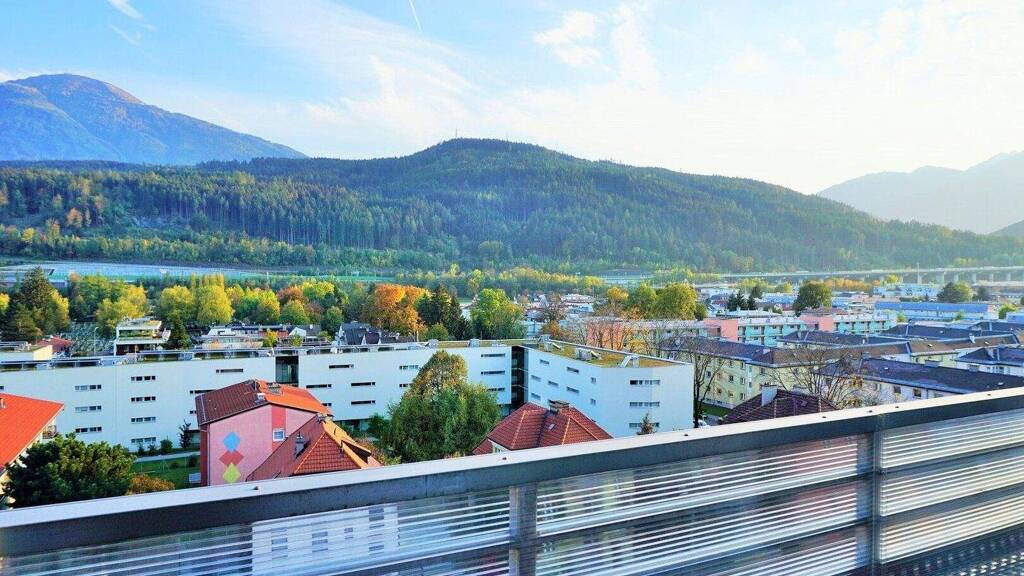 Vom großzügigen Wohnraum gelangt man einerseits in die kleine separate Einbauküche, mit Fenster Richtung Osten und andererseits auf den Balkon, der nach Süden ausgerichtet ist und auf Grund der Lage im 8. Stock eine herrliche Aussicht u.a. auf den Patscherkofel gewährt.