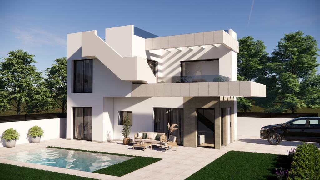 Beide Villenmodelle erstrecken sich über zwei Ebenen und die Innenaufteilung besteht aus einem hellen und geräumigen Wohn- und Essbereich mit großen Fenstern, die für viel natürliches Licht sorgen und Zugang zur Terrasse bieten. Im Hauptwohnbereich befindet sich eine voll ausgestattete moderne Küche im amerikanischen Stil. Im Erdgeschoss befinden sich außerdem ein Doppelschlafzimmer und ein separates Gästebad. Die Innentreppe führt Sie in den ersten Stock mit dem großen Hauptschlafzimmer, einem weiteren großen Schlafzimmer mit Doppelbett und einem zweiten separaten Gästebad. Die Villen verfügen über einen großen Außenbereich, um das Leben im Freien in Spanien zu genießen, mit einem eigenen Garten und einer Terrasse zum Entspannen am privaten Swimmingpool. Die erste Etage verfügt über eine großzügige Sonnenterrasse und die optionale zusätzliche Dachterrasse wird über eine Außentreppe von dieser Terrasse aus erreicht.