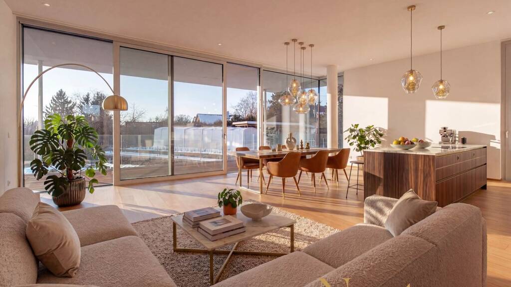 Die diversen Räumlichkeiten dieser Wohnung werden nahezu malerisch in Szene gesetzt - bodentiefe Glasfronten sorgen für eine entspannte und angenehme Wohnatmosphäre. In den Nassbereichen kommen zeitlose Feinsteinzeug-Fliesen zum Einsatz, während in den Wohn- und Schlafräumen ein edler Eichen-Echtholzparkettboden verlegt ist. Die dreifach verglasten Schallschutzfenster werden darüber hinaus mit elektrisch gesteuerten Raffstores versehen.