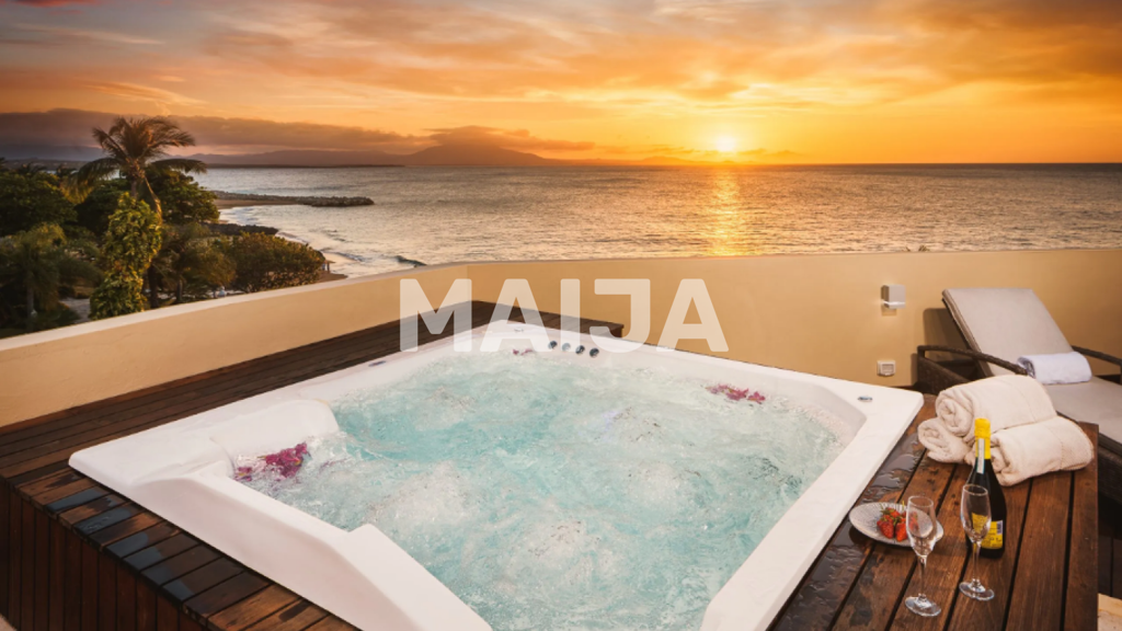 Die Wohnung bietet einen Balkon im Erdgeschoss und ein Sonnendach im zweiten Stock. Eines der Highlights dieser Wohnung ist der private Jacuzzi auf dem Sonnendach.