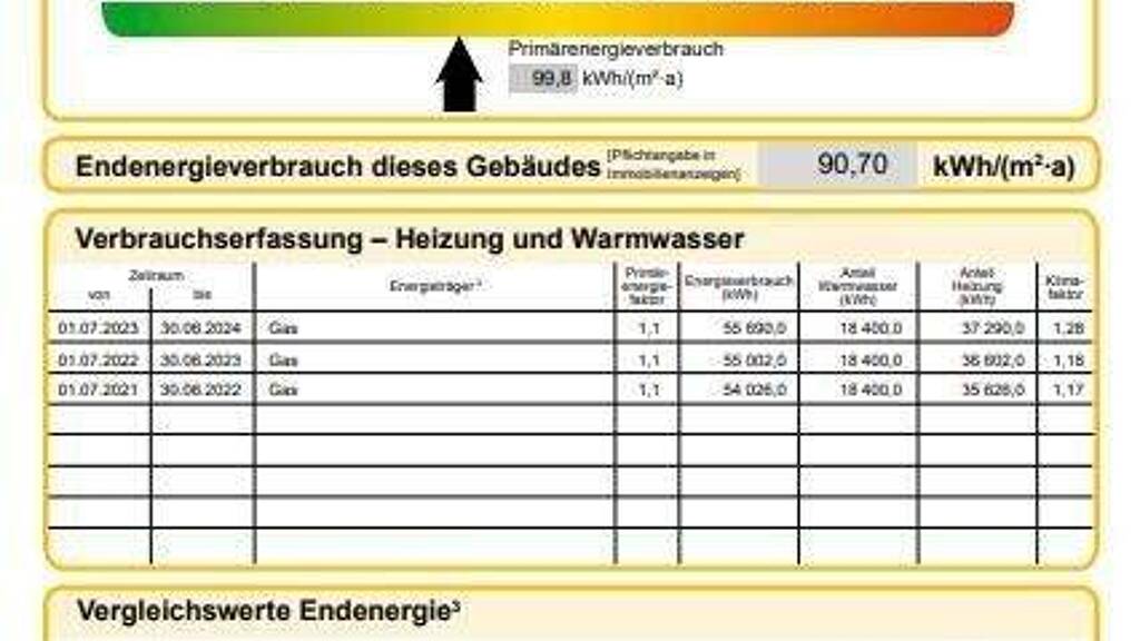 Energieausweis Energieverbrauch 90,7 kWh Wesentlicher Energieträger Gas Effizienzklasse C Baujahr Wärmeerzeuger circa 2015 Gültig bis 2034