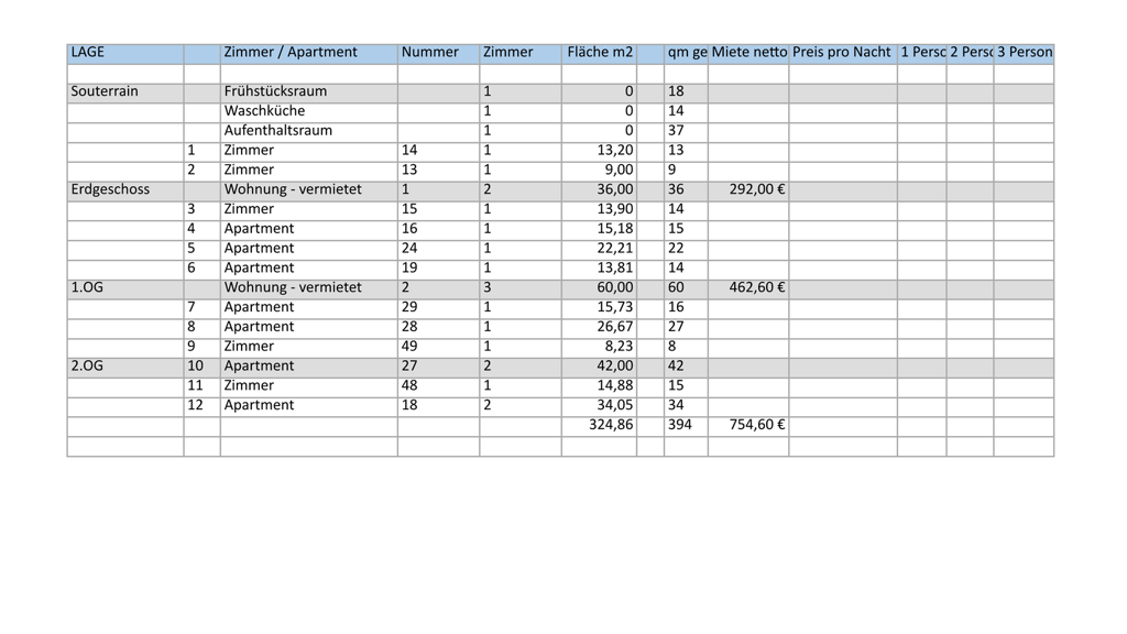 Aktuell sind es 12 Ferienapartments und 69qm für weitere Ferienapartments geeignet und 2 aktuell dauerhaft vermietete Wohneinheiten.