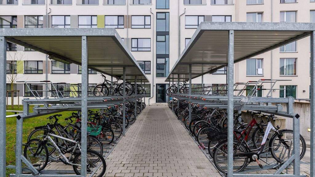 . Privates Badezimmer . Eigene Küche mit Herd, Mikrowellenofen & Kühlschrank . Bett mit Sofafunktion (100 x 200 cm) mit Stauraum . Voll möbliert (Bett, Matratze, Schreibtisch, Stuhl, Kleiderschrank) . Gemeinschaftsbereiche: Fitnessstudio, Lernräume, Lounge, Dachterrasse, Waschräume . All Inclusive Miete: Wasser, Strom, Heizung und Internet inklusive