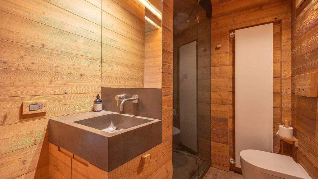 Jedes Detail ist wie auf einer Luxusyacht durchdacht: versteckte Funktionalität, sichtbarer Komfort. Verkleidungen aus gealterter Fichte und Naturstein schaffen eine warme, einladende Atmosphäre, während die Panoramaterrasse einen atemberaubenden Blick auf die verschneiten Gipfel bietet.