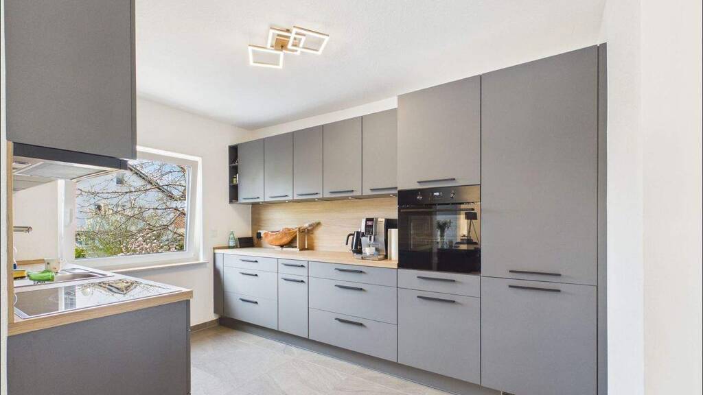 Erdgeschosswohnung (vermietet, modernisiert): Die im Januar 2026 umfassend modernisierte Erdgeschosswohnung ist aktuell für 1.300 € Kaltmiete vermietet und überzeugt durch eine durchdachte Raumaufteilung sowie eine hochwertige, zeitgemäße Ausstattung. Vom großzügigen Eingangsbereich aus erschließen sich ein Gäste-WC, die Küche mit Essbereich sowie das helle Wohnzimmer mit direktem Zugang zu einem der Balkone.