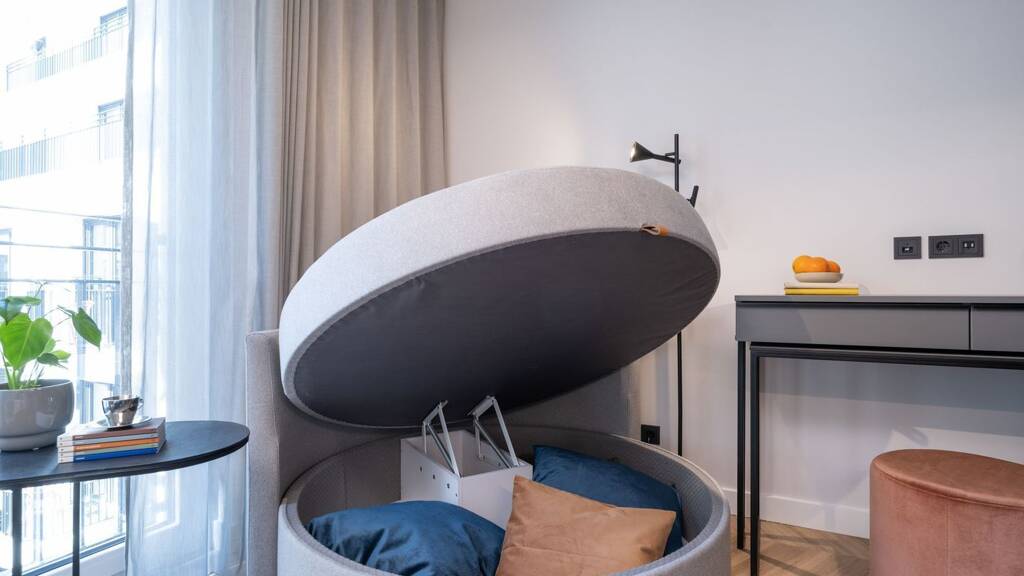 - Generous storage space (storage space under the couch, ceiling-high wardrobe with separate shoe rack)