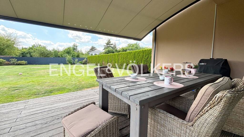 Dieses moderne Architekten-Haus im Bungalowstil aus dem Jahr 2016 vereint zeitlose Eleganz mit durchdachter Funktionalität und luxuriöser Ausstattung. Auf einer großzügigen Wohnfläche von circa 136 m² bietet das ebenerdige Haus höchsten Wohnkomfort für anspruchsvolle Bewohner - eingebettet in ein weitläufiges Grundstück von circa 1.419 m². Herzstück des Hauses ist der offen gestaltete Wohn- und Essbereich, der durch große Glasfronten einen beeindruckenden Blick auf das gepflegte Grundstück ermöglicht. Der direkte Zugang zur großzügigen Terrasse erweitert den Wohnraum nach außen und lädt zum Entspannen oder geselligen Beisammensein ein. Insgesamt verteilen sich vier Zimmer auf den durchdachten Grundriss - darunter ein Schlafzimmer mit direktem Zugang zur Terrasse, auf der ein Whirlpool zum Wohlfühlen und Relaxen einlädt. Zusätzlich stehen ein Büro, ein Hauswirtschaftsraum sowie eine hochwertige Einbauküche mit Markengeräten zur Verfügung. Der Hauswirtschaftsraum bietet nicht nur praktische Abstellmöglichkeiten, sondern auch einen direkten Zugang zur integrierten Doppelgarage. Die Ausstattung lässt keine Wünsche offen: Eine Fußbodenheizung sorgt im gesamten Haus für angenehme Wärme, ergänzt durch eine moderne Klimaanlage für heiße Tage. Eine Alarmanlage bietet zusätzliche Sicherheit. Zur technischen Ausstattung gehören unter anderem eine Bus-Steuerung (Smart Home), Solarthermie für Warmwasser, eine automatische Gartenbewässerung sowie eine elektrisch betriebene Markise. Der Bungalow ist ideal für alle, die ein exklusives Ambiente in ruhiger Lage suchen - ohne auf Komfort, Design und moderne Technik verzichten zu müssen.