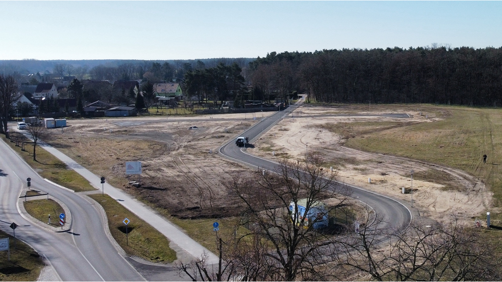 Zwischenzeitlich erfolgten die Arbeiten zur Erschließung. Das bedeutet alle Medien liegen an oder auf Ihrem Grundstück. Der komplette Straßenbau mit Beleuchtung und Grünplanung ist fertig gestellt.