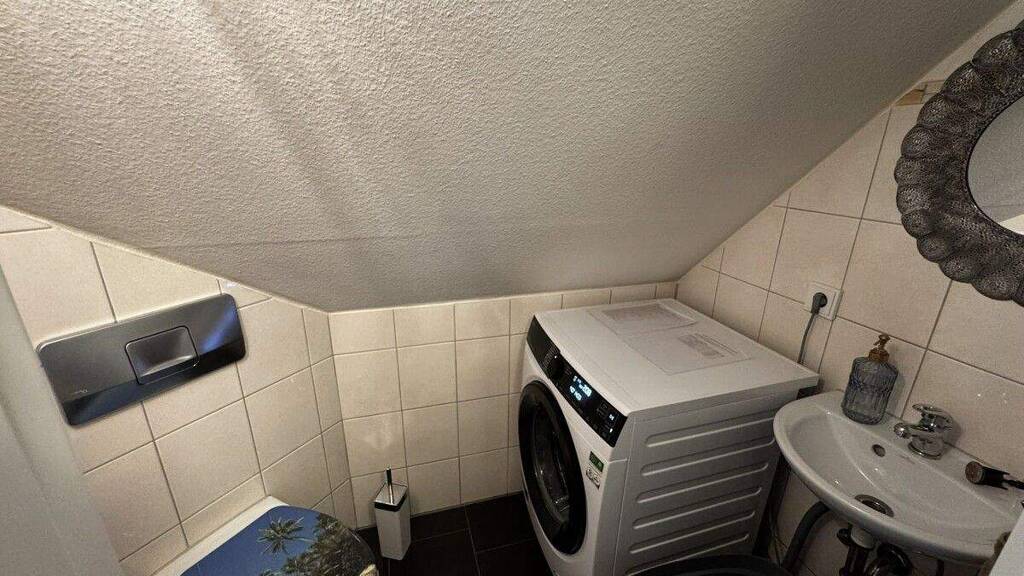 Die Wohnung ist bequem über das Treppenhaus erreichbar. Beim Betreten empfängt Sie ein freundlicher Flur, von dem aus alle Räume der unteren Wohnebene zugänglich sind. Hier befinden sich ein separates WC mit Waschmaschinenanschluss, ein Badezimmer mit Badewanne sowie eine großzügig geschnittene Küche mit Einbauküche und Platz für eine gemütliche Frühstücksecke.