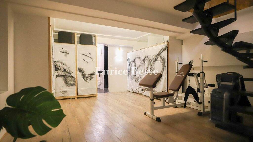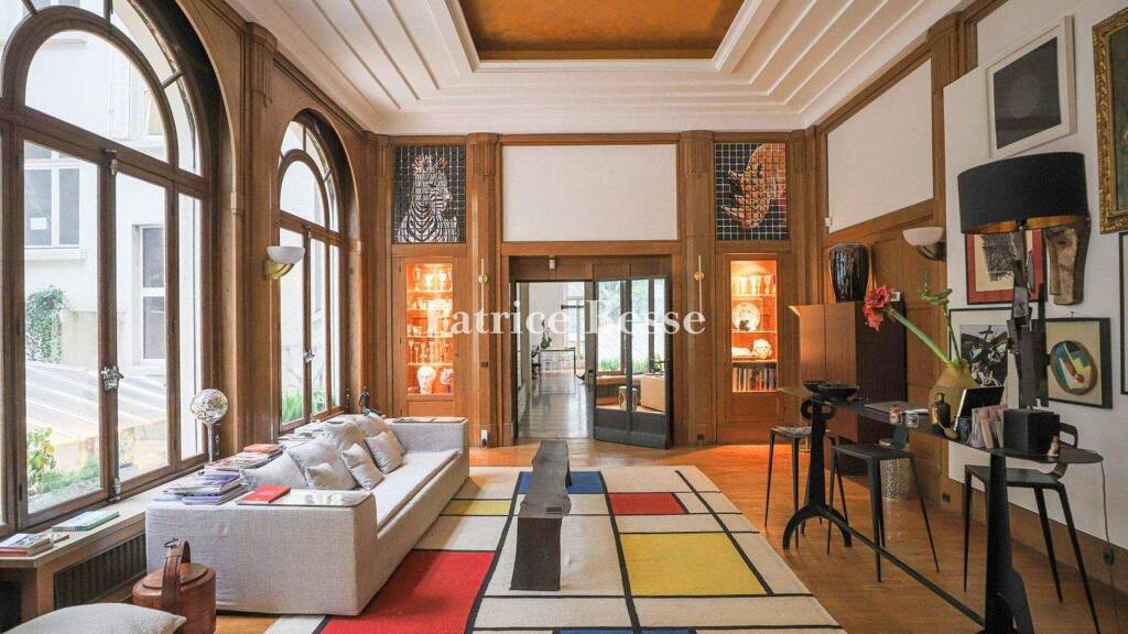 A house reminiscent of the Roaring Twenties with period decorations on a discreet street, between Parc Monceau and Rue du Faubourg-Saint-Honoré. Through the heavy wrought iron gate, the entrance hall boasts a striking 3.90 metre high cross-vaulted ceiling. The floor is laid with diagonal marble tiles forming black and cream diamonds. The entrance hall with its succession of arched windows, one of which is equipped with a double-glazed door, also provides access to the other two levels of the property. The lower level comprises a gym with a shower room and sauna on one side; on the other, a lounge, a boiler room and a cellar. The upper level is accessed from the entrance via a majestic marble staircase with a masonry balustrade topped by Art-Deco style wrought ironwork supporting the handrail. On the main floor, on the left, the lounge is illuminated by three large arched windows overlooking the garden. The walls are clad with solid oak panelling, vertically punctuated by leaning columns with sculpted capitals. The floors are of solid parquet. At 4.60 metres from the floor, the ceiling features a stepped perimeter cornice and indirect lighting. Opposite the entrance, the stone fireplace accentuates the axis of the room and display cabinets are positioned on either side. On the other side of the room, the kitchen is partly open to the dining room and its large window overlooking the street. A corridor serves the master bedroom with an en suite bathroom and two other bedrooms, each with its own tiled shower room. A toilet is also accessed from the corridor. This level can also be reached from the communal areas of the building, through another door. An independent studio flat on three levels is accessed from the entrance: On the ground floor, the kitchen opens onto a living room and a wooden staircase leads up to a mezzanine with a sleeping area. A second concrete staircase leads to the lower level. An intermediate landing serves the lavatory. A few steps further down is a bedroom with a window and a bathroom at the back. The property includes part of a commercial property.