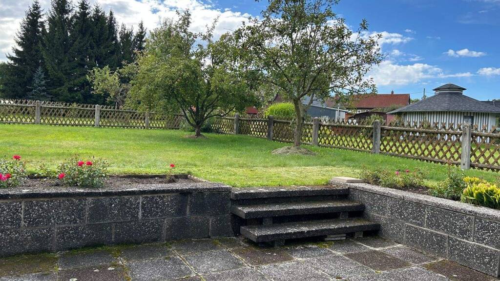 Im ersten Eindruck grüßt ein hübscher Vorgarten. Der Weg ins Haus führt charmanter Weise nach hinten über die Steinterrasse. Hier öffnet sich auch das Grundstück zum Rasen und dem massiv erbauten Nebengebäude. Auch die altbekannten festen Wäschestangen gibt es hier, entweder geeignet für Wäscheleinen, für Kinder zum Zelt bauen oder zum Anhängen einer Schaukel. Kinder werden das Grundstück sehr mögen.