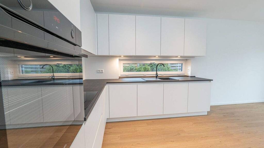 Am Ende des Flures öffnet sich der L-förmige Wohn-, Ess- und Kochbereich. Die hochwertige, zeitlose Einbauküche lässt keine Wünsche offen: Geschirrspüler, Kühlschrank mit Gefrierfach und Induktionskochfeld bieten besten Komfort. Ein besonderes Highlight ist das große Panoramafenster, durch das Sie beim Kochen einen wunderbaren Blick ins Freie genießen können. Eine großzügige Arbeitsfläche und viel Stauraum runden das Angebot ab.